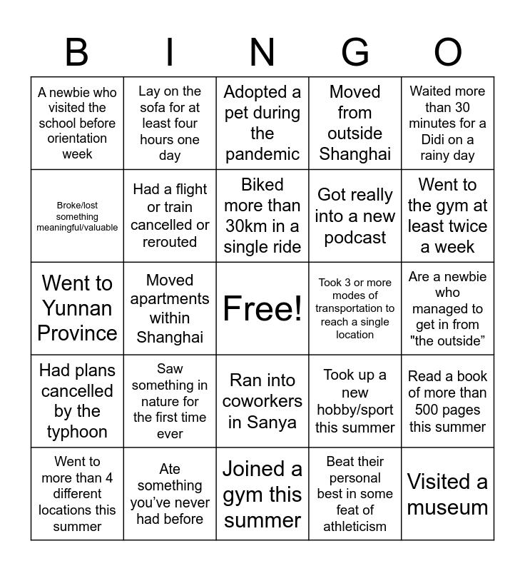 This bingo card has a free space and 40 words: Unexpectedly (and unfortunately?) ran into a student on vacation, Went to Yunnan Province, Accidentally “tickled” someone in a groupchat (must state who), Had a flight or train cancelled or rerouted, Ate something you’ve never had before, Ran into coworkers in Sanya, Biked more than 30km in a single ride, Will claim your travel allowance with a single fapiao, Waited more than 30 minutes for a Didi on a rainy day, Had plans cancelled by the typhoon, Moved apartments within Shanghai, Moved from outside Shanghai, Visited a museum, Are a newbie who managed to get in from "the outside”, Took 3 or more modes of transportation to reach a single location, Saw something in nature for the first time ever, Is teaching all new courses this year, A newbie who visited the school before orientation week, Learned a new skill in quarantine, Adopted a pet during the pandemic, Read a book of more than 500 pages this summer, Beat their personal best in some feat of athleticism, Got really into a new podcast, Broke/lost something meaningful/valuable, Binge watched at least 10 episodes of show in one day, Moved to the SRC, Moved out of the SRC, Had a green code mishap, Spent more than 8 hours in an airport, Had to visit the ER, Travelled solo for longer than a week, Went to more than 4 different locations this summer, Swam in a lake or river, Took up a new hobby/sport this summer, Went to the gym at least twice a week, Joined a gym this summer, Cut calories by switching to wine, Learned a new instrument, Lay on the sofa for at least four hours one day and Watched the Olympics all day during the typhoon.