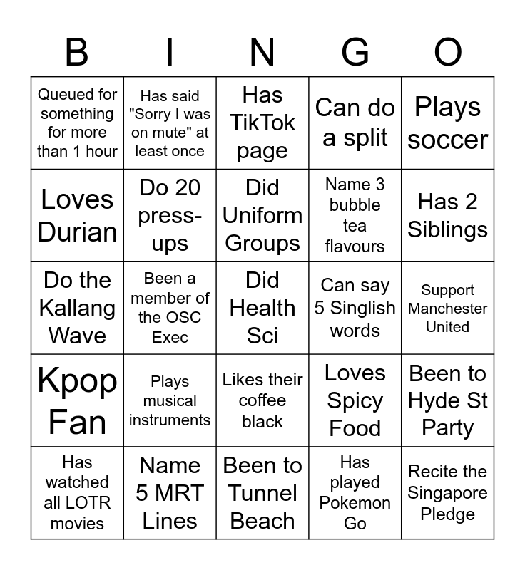 This bingo card has a free space and 24 words: Plays musical instruments, Name 5 MRT Lines, Did Uniform Groups, Has watched all LOTR movies, Plays soccer, Queued for something for more than 1 hour, Loves Durian, Has said "Sorry I was on mute" at least once, Can say 5 Singlish words, Likes their coffee black, Name 3 bubble tea flavours, Do the Kallang Wave, Loves Spicy Food, Been to Hyde St Party, Do 20 press-ups, Has played Pokemon Go, Support Manchester United, Has TikTok page, Has 2 Siblings, Been a member of the OSC Exec, Recite the Singapore Pledge, Kpop Fan, Can do a split and Been to Tunnel Beach.