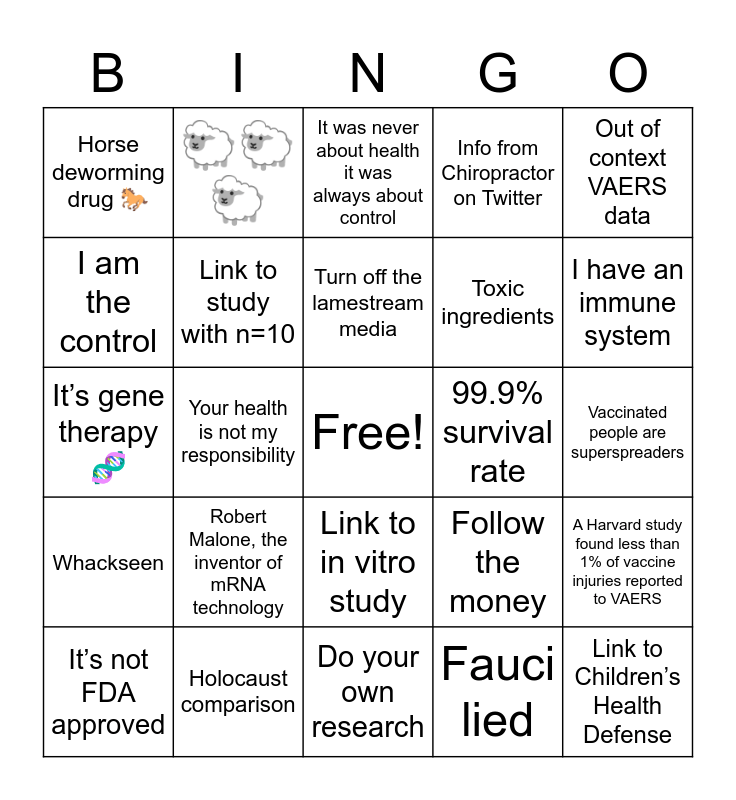 This bingo card has a free space and 24 words: Robert Malone, the inventor of mRNA technology, Holocaust comparison, Turn off the lamestream media, Itβs not FDA approved, Out of context VAERS data, Horse deworming drug π, I am the control, πππ, 99.9% survival rate, Link to in vitro study, Toxic ingredients, Itβs gene therapy π§¬, Follow the money, A Harvard study found less than 1% of vaccine injuries reported to VAERS, Link to study with n=10, Fauci lied, Vaccinated people are superspreaders, It was never about health it was always about control, I have an immune system, Your health is not my responsibility, Link to Childrenβs Health Defense, Whackseen, Info from Chiropractor on Twitter and Do your own research.
