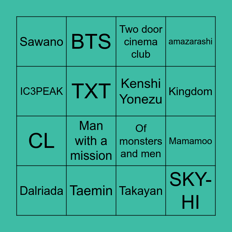This bingo card has 16 words: Taemin, Mamamoo, Two door cinema club, Sawano, CL, BTS, Of monsters and men, Takayan, IC3PEAK, TXT, Dalriada, amazarashi, Man with a mission, Kingdom, Kenshi Yonezu and SKY-HI.