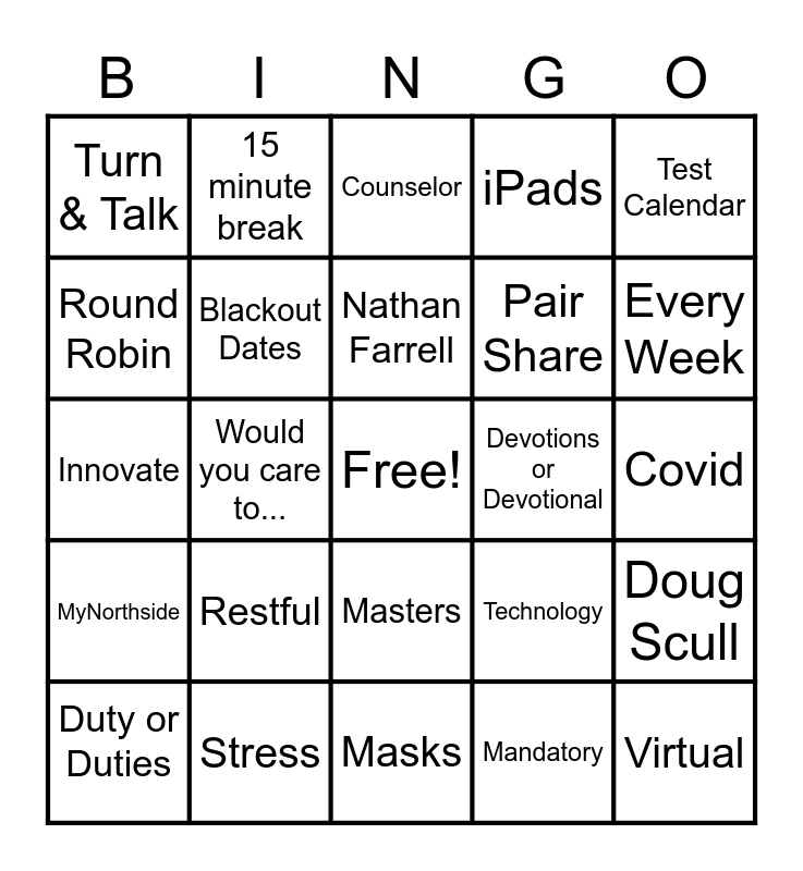 This bingo card has a free space and 29 words: Duty or Duties, Blood-born pathogens, Would you care to..., Apple Teacher, Turn & Talk, Counselor, Blackout Dates, Restful, Devotions or Devotional, Stress, Covid, Virtual, Masks, Mandatory, Every Week, Doctorate, Masters, MyNorthside, Test Calendar, Innovate, Technology, Flipped Classroom, Pair Share, Round Robin, iPads, 15 minute break, Doug Scull, Nathan Farrell and Kagan.