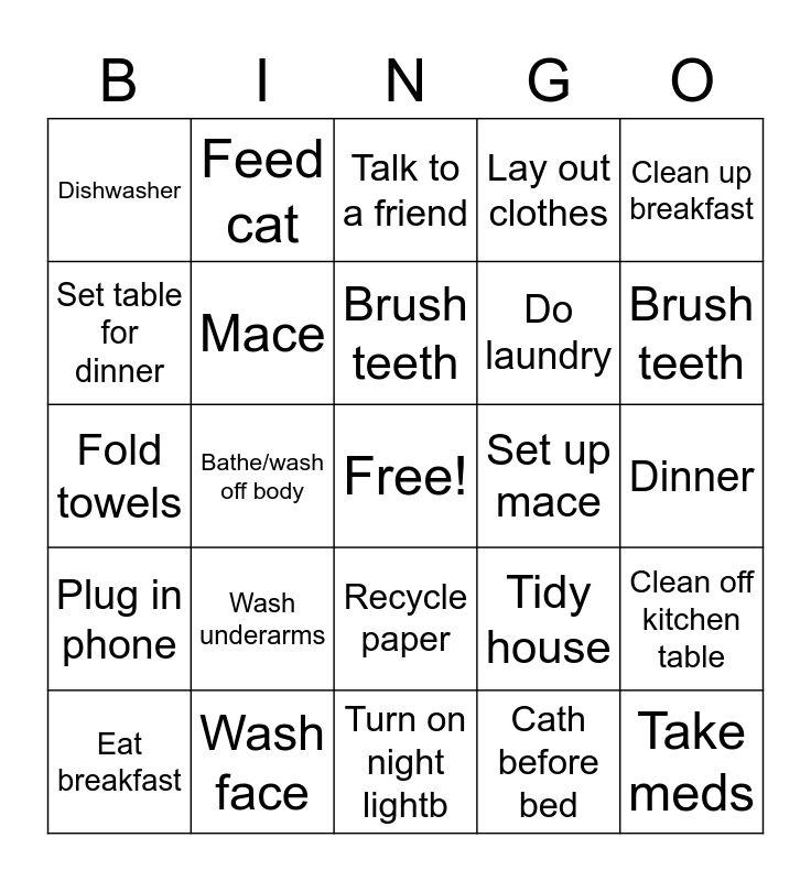 This bingo card has a free space and 24 words: Wash underarms, Wash face, Brush teeth, Eat breakfast, Clean up breakfast, Dishwasher, Set table for dinner, Feed cat, Set up mace, Recycle paper, Do laundry, Fold towels, Tidy house, Clean off kitchen table, Mace, Cath before bed, Dinner, Talk to a friend, Brush teeth, Bathe/wash off body, Take meds, Plug in phone, Lay out clothes and Turn on night lightb.