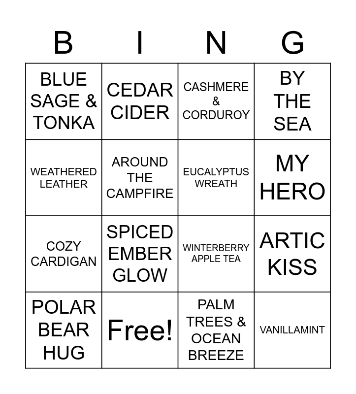 This bingo card has 29 words: AMAZON RAIN, ALOE WATER & CUCUMBER, ARTIC KISS, BE MERRY, BLUE SAGE & TONKA, CASHMERE & CORDUROY, EUCALYPTUS WREATH, GRAHAM CRACKER CRUNCH, Free!, HARVEST BLESSINGS, PALM TREES & OCEAN BREEZE, POLAR BEAR HUG, POMEGRANATE PROSECCO, SCARLET SUNFLOWER, SPICED EMBER GLOW, TINSEL BERRY, VANILLA BLACKBERRY, VANILLAMINT, WEATHERED LEATHER, WINTERBERRY APPLE TEA, HUNDRED ACRE WOOD, A-PEELING APPLE, COZY CARDIGAN, AROUND THE CAMPFIRE, BY THE SEA, CEDAR CIDER, CLOTHESLINE, MY HERO and VERY SNOWY SPRUCE.