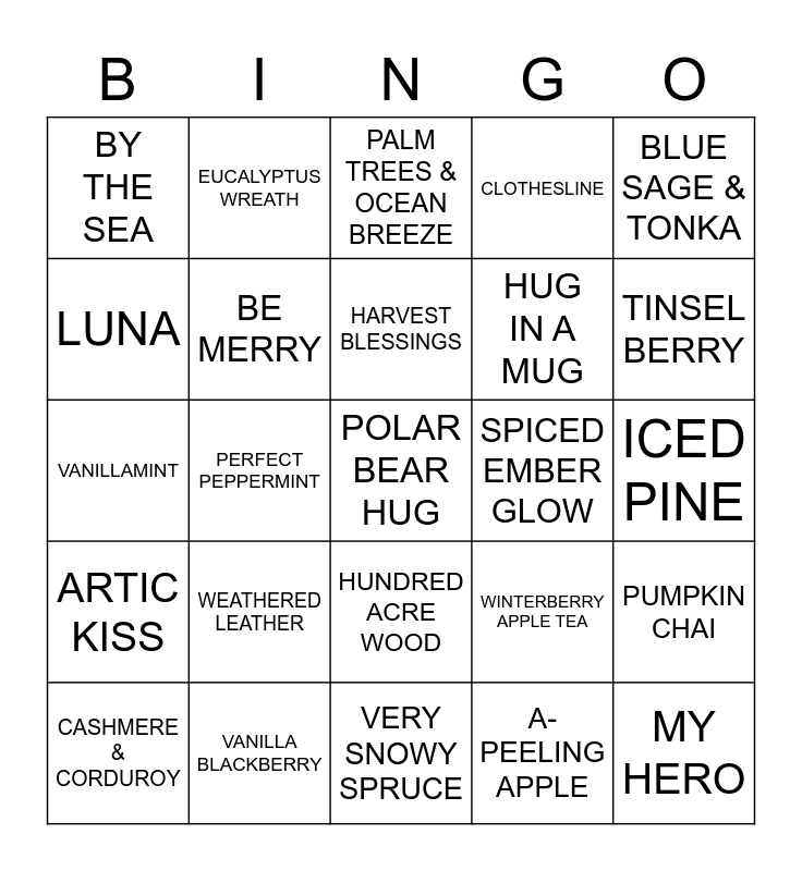 This bingo card has a free space and 34 words: AMAZON RAIN, A-PEELING APPLE, COZY CARDIGAN, ALOE WATER & CUCUMBER, ARTIC KISS, BE MERRY, BLUE SAGE & TONKA, CASHMERE & CORDUROY, EUCALYPTUS WREATH, GRAHAM CRACKER CRUNCH, HARVEST BLESSINGS, PALM TREES & OCEAN BREEZE, POMEGRANTE PROSECCO, SCARLET SUNFLOWER, SPICED EMBER GLOW, TINSEL BERRY, VANILLA BLACKBERRY, VANILLAMINT, WEATHERED LEATHER, WINTERBERRY APPLE TEA, HUNDRED ACRE WOOD, AROUND THE CAMPFIRE, BY THE SEA, ICED PINE, VERY SNOWY SPRUCE, MY HERO, CLOTHESLINE, JUST BREATHE, HUG IN A MUG, LUNA, MARVEL:NINE REALMS, PERFECT PEPPERMINT, PUMPKIN CHAI and SALTED CARAMEL TOFFEE.