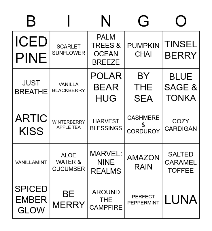 This bingo card has a free space and 33 words: A-PEELING APPLE, HUNDRED ACRE WOOD, WINTERBERRY APPLE TEA, WEATHERED LEATHER, VANILLAMINT, VANILLA BLACKBERRY, TINSEL BERRY, SPICED EMBER GLOW, SCARLET SUNFLOWER, POMEGRANATE PROSECCO, POLAR BEAR HUG, PALM TREES & OCEAN BREEZE, GRAHAM CRACKER CRUNCH, EUCALYPTUS WREATH, CASHMERE & CORDUROY, BLUE SAGE & TONKA, BE MERRY, ARTIC KISS, ALOE WATER & CUCUMBER, AMAZON RAIN, MARVEL: NINE REALMS, VERY SNOWY SPRUCE, ICED PINE, COZY CARDIGAN, AROUND THE CAMPFIRE, LUNA, PUMPKIN CHAI, BY THE SEA, JUST BREATHE, SALTED CARAMEL TOFFEE, MY HERO, PERFECT PEPPERMINT and CLOTHESLINE.