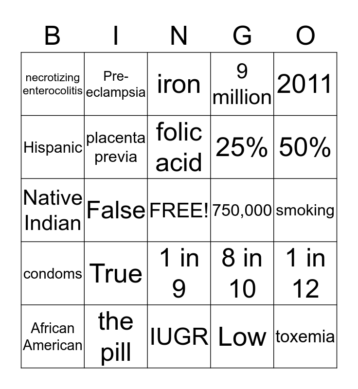 This bingo card has a free space and 24 words: True, the pill, folic acid, African American, 2011, necrotizing enterocolitis, Hispanic, Pre-eclampsia, 750,000, 1 in 9, 25%, Native Indian, 8 in 10, 1 in 12, placenta previa, Low, smoking, iron, 50%, False, toxemia, condoms, 9 million and IUGR.