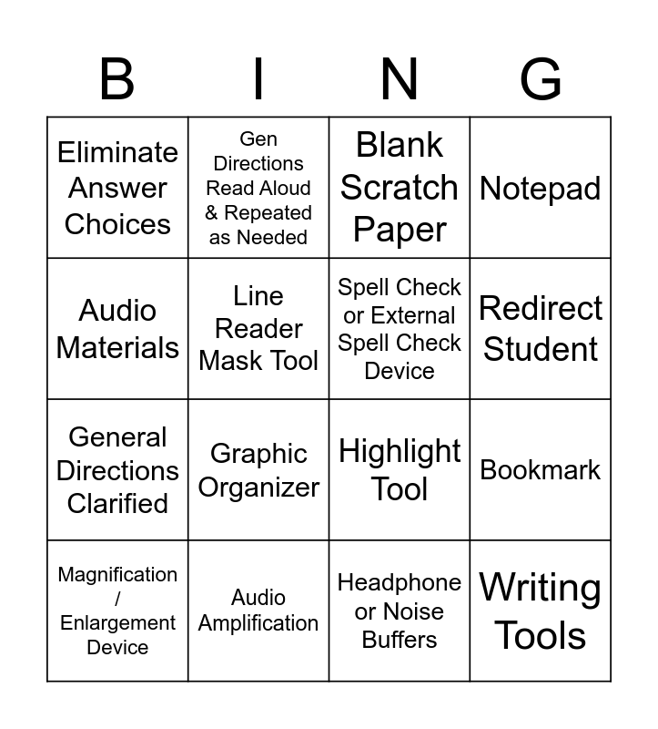 This bingo card has 16 words: Audio Amplification, Bookmark, Blank Scratch Paper, Eliminate Answer Choices, General Directions Clarified, Gen Directions Read Aloud & Repeated as Needed, Highlight Tool, Headphone or Noise Buffers, Audio Materials, Line Reader Mask Tool, Magnification / Enlargement Device, Notepad, Graphic Organizer, Redirect Student, Spell Check or External Spell Check Device and Writing Tools.