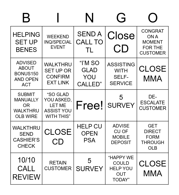 This bingo card has a free space and 24 words: CLOSE CD, RETAIN CUSTOMER, “I’M SO GLAD YOU CALLED”, 10/10 CALL REVIEW, CONGRAT ON A MOMENT FOR THE CUSTOMER, HELPING SET UP BENES, ADVISED ABOUT BONUS150 AND OPEN ACT, WEEKEND INQ/SPECIAL EVENT, 5 SURVEY, HELP CU OPEN PSA, ASSISTING WITH SELF- SERVICE, SUBMIT MANUALLY OR WALKTHRU OLB WIRE, ADVISE CU OF MOBILE DEPOSIT, GET DIRECT FORM THROUGH OLB, WALKTHRU SET UP OR CONFIRM EXT LINK, “HAPPY WE COULD HELP YOU OUT TODAY”, DE-ESCALATE CUSTOMER, SEND A CALL TO TL, CLOSE MMA, “SO GLAD YOU ASKED, LET ME ASSIST YOU WITH THIS”, CLOSE MMA, WALKTHRU SEND CASHIER’S CHECK, Close CD and 5 SURVEY.