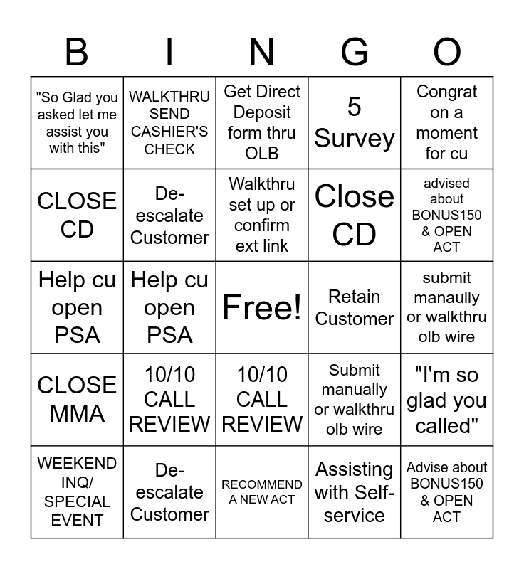 This bingo card has a free space and 48 words: Help set up bene, Advise about BONUS150 & OPEN ACT, WEEKEND INQ/ SPECIAL EVENT, RECOMMEND A NEW ACT, 10/10 CALL REVIEW, CLOSE MMA, WALKTHRU SEND CASHIER'S CHECK, "HAPPY WE COULD HELP YOU OUT TODAY!", CLOSE CD, Build connection, De-escalate Customer, 5 Survey, "I'm so glad you called", Submit manually or walkthru olb wire, 5 Survey, Advise CU of Mobile Deposit, Walkthru set up or confirm ext link, Retain Customer, Get Direct Deposit form thru OLB, Congrat on a moment for cu, Help cu open PSA, Assisting with Self- service, "So Glad you asked let me assist you with this", Close CD, helping set up bene, advised about BONUS150 & OPEN ACT, WEEKEND INQ/ SPECIAL EVENT, RECOMMEND A NEW ACT, 10/10 CALL REVIEW, CLOSE MMA, WALKTHRU SEND CASHIER'S CHECK, "HAPPY WE COULD HELP YOU OUT TODAY!", CLOSE CD, Build connection, De-escalate Customer, 5 Survey, "im so glad you called", submit manaully or walkthru olb wire, 5 Survey, Advise CU of Mobile Deposit, Walkthru set up or confirm ext link, Retain Customer, Get Direct Deposit form thru OLB, Congrat on a moment for cu, Help cu open PSA, Assisting with Self- service, "So Glad you asked let me assist you with this" and Close CD.