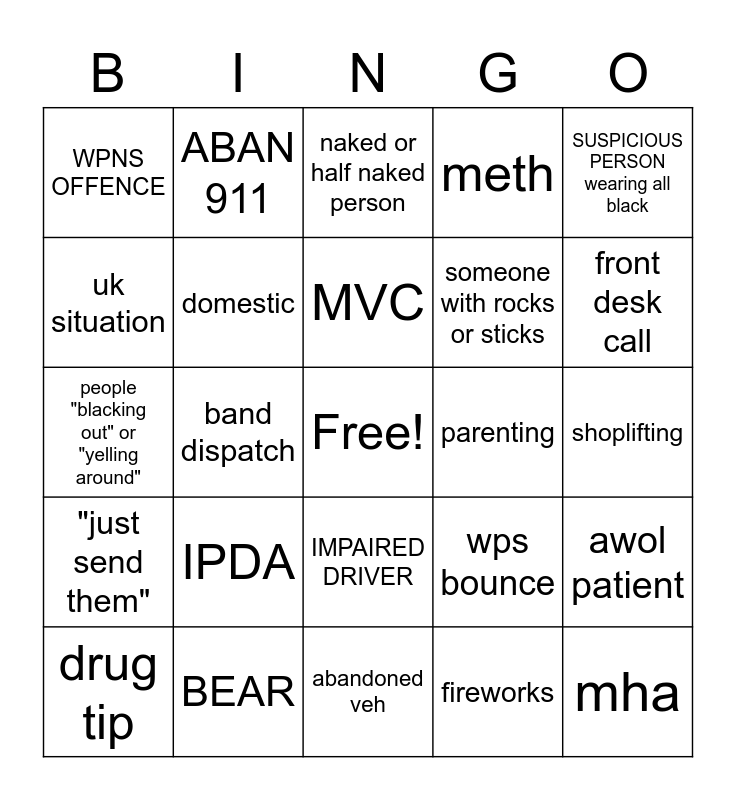 This bingo card has a free space and 24 words: IPDA, BEAR, MVC, drug tip, SUSPICIOUS PERSON wearing all black, WPNS OFFENCE, uk situation, ABAN 911, parenting, IMPAIRED DRIVER, someone with rocks or sticks, people "blacking out" or "yelling around", wps bounce, awol patient, domestic, fireworks, shoplifting, naked or half naked person, front desk call, band dispatch, mha, "just send them", meth and abandoned veh.