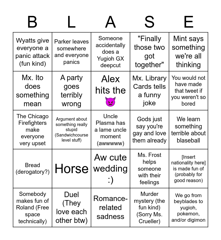 This bingo card has a free space and 24 words: Horse, Duel (They love each other btw), Alex hits the👿, Somebody makes fun of Roland (Free space technically), Mint says something we're all thinking, Wyatts give everyone a panic attack (fun kind), Mx. Ito does something mean, Parker leaves somewhere and everyone panics, Gods just say you're gay and love them already, Aw cute wedding :), Mx. Library Cards tells a funny joke, The Chicago Firefighters make everyone very upset, Ms. Frost helps someone with their feelings, [Insert nationality here] is made fun of (probably for good reason), A party goes terribly wrong, Murder mystery (the fun kind) (Sorry Ms. Crueller), We learn something terrible about blaseball, Someone accidentally does a Yugioh GX deepcut, You would not have made that tweet if you weren't so bored, Argument about something really stupid (Sandwichcourse level stuff), We go from beyblades to yugioh, pokemon, and/or digimon, Bread (derogatory?), "Finally those two got together" and Romance-related sadness.