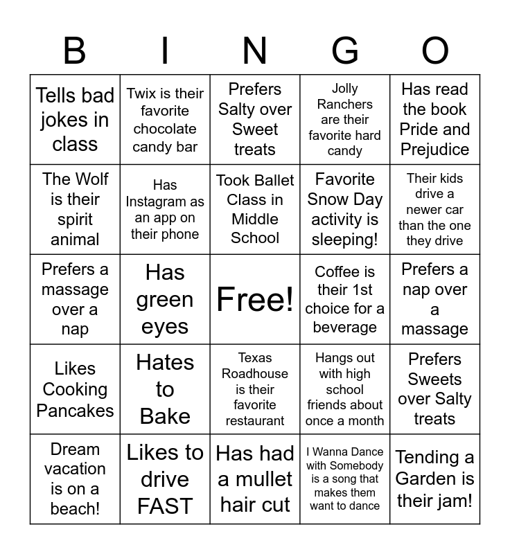 This bingo card has a free space and 24 words: Hates to Bake, Likes to drive FAST, Took Ballet Class in Middle School, Dream vacation is on a beach!, Has read the book Pride and Prejudice, Tells bad jokes in class, The Wolf is their spirit animal, Twix is their favorite chocolate candy bar, Coffee is their 1st choice for a beverage, Texas Roadhouse is their favorite restaurant, Favorite Snow Day activity is sleeping!, Prefers a massage over a nap, Hangs out with high school friends about once a month, Prefers Sweets over Salty treats, Has Instagram as an app on their phone, I Wanna Dance with Somebody is a song that makes them want to dance, Prefers a nap over a massage, Prefers Salty over Sweet treats, Their kids drive a newer car than the one they drive, Has green eyes, Tending a Garden is their jam!, Likes Cooking Pancakes, Jolly Ranchers are their favorite hard candy and Has had a mullet hair cut.