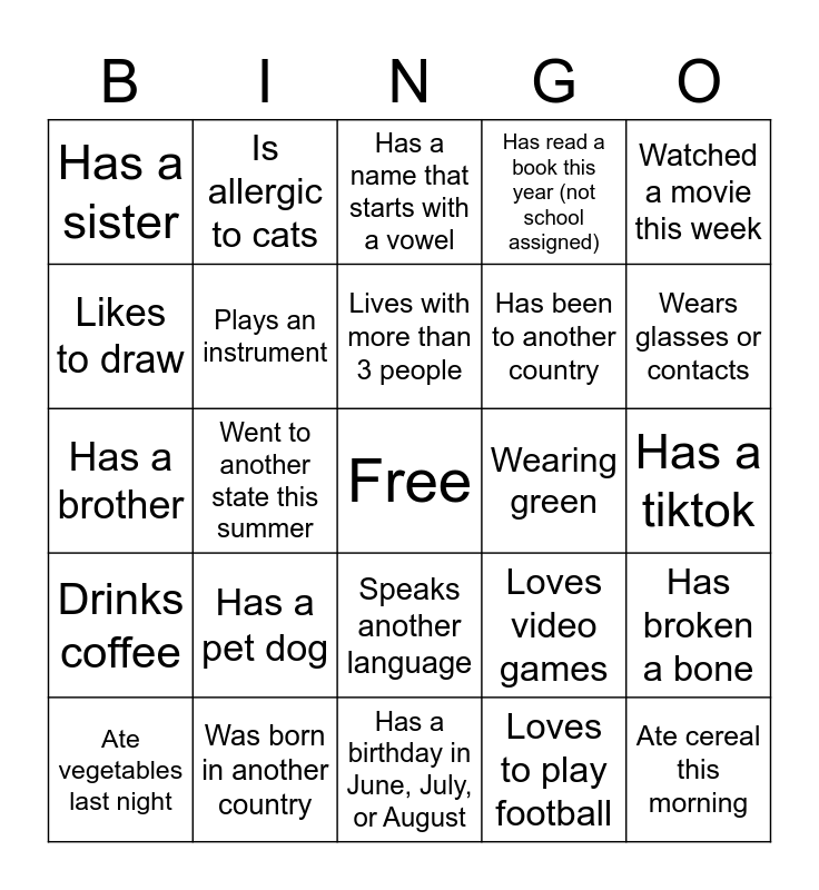 This bingo card has a free space and 24 words: Has a pet dog, Was born in another country, Lives with more than 3 people, Ate vegetables last night, Watched a movie this week, Has a sister, Likes to draw, Is allergic to cats, Wearing green, Speaks another language, Has been to another country, Has a brother, Loves video games, Has broken a bone, Plays an instrument, Loves to play football, Has a tiktok, Has a name that starts with a vowel, Wears glasses or contacts, Went to another state this summer, Ate cereal this morning, Drinks coffee, Has read a book this year (not school assigned) and Has a birthday in June, July, or August.