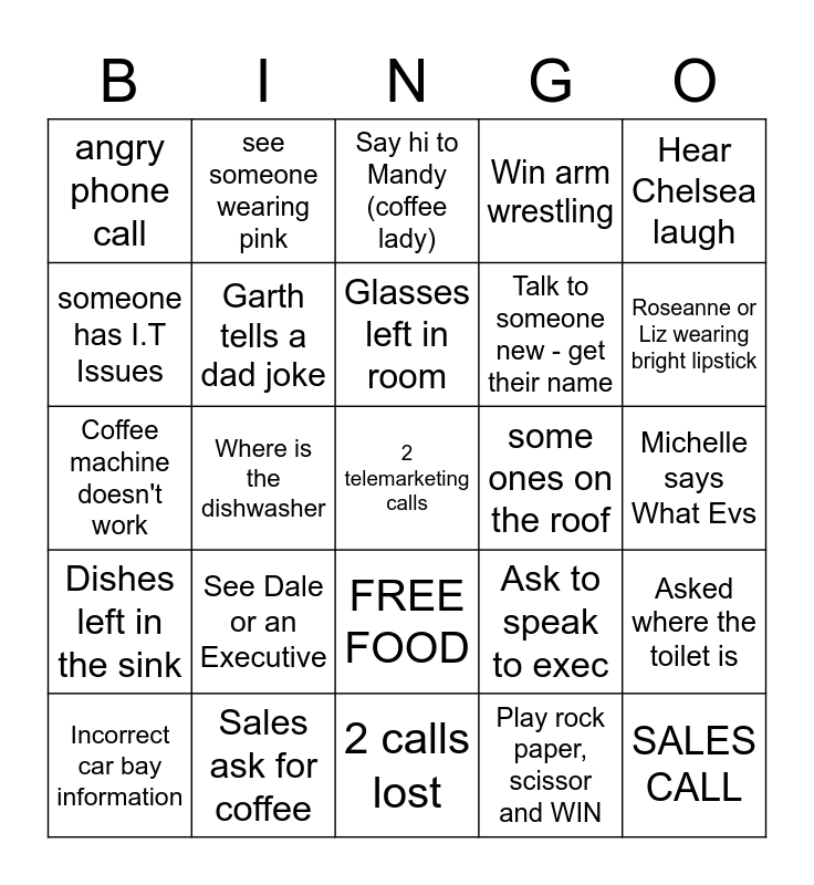 This bingo card has a free space and 24 words: See Dale or an Executive, Sales ask for coffee, Glasses left in room, Incorrect car bay information, Hear Chelsea laugh, angry phone call, someone has I.T Issues, see someone wearing pink, some ones on the roof, FREE FOOD, Talk to someone new - get their name, Coffee machine doesn't work, Ask to speak to exec, Asked where the toilet is, Garth tells a dad joke, Play rock paper, scissor and WIN, Michelle says What Evs, Say hi to Mandy (coffee lady), Roseanne or Liz wearing bright lipstick, Where is the dishwasher, SALES CALL, Dishes left in the sink, Win arm wrestling and 2 calls lost.