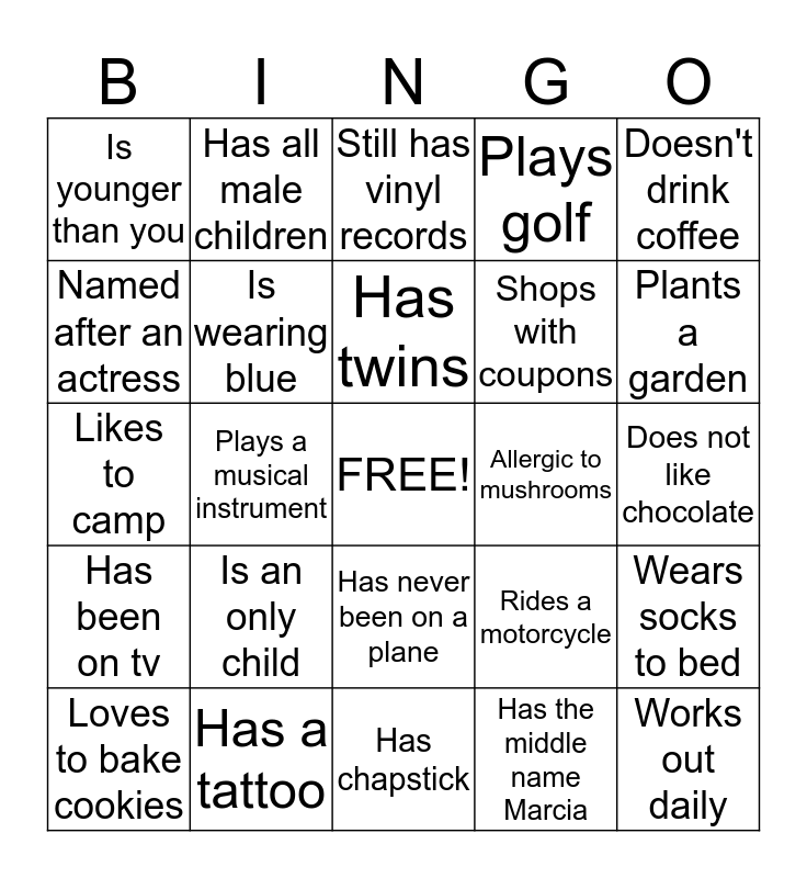 This bingo card has a free space and 24 words: Is an only child, Has a tattoo, Has twins, Loves to bake cookies, Doesn't drink coffee, Is younger than you, Named after an actress, Has all male children, Allergic to mushrooms, Has never been on a plane, Shops with coupons, Likes to camp, Rides a motorcycle, Wears socks to bed, Is wearing blue, Has the middle name Marcia, Does not like chocolate, Still has vinyl records, Plants a garden, Plays a musical instrument, Works out daily, Has been on tv, Plays golf and Has chapstick.