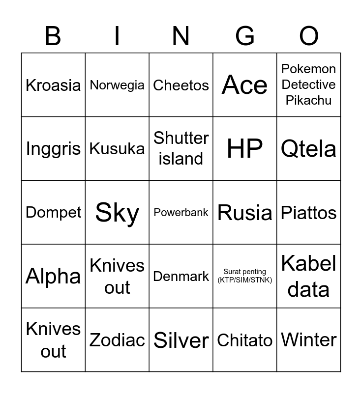 This bingo card has a free space and 24 words: Knives out, Zodiac, Shutter island, Knives out, Pokemon Detective Pikachu, Kroasia, Inggris, Norwegia, Rusia, Denmark, HP, Dompet, Surat penting (KTP/SIM/STNK), Kabel data, Kusuka, Chitato, Piattos, Cheetos, Qtela, Sky, Winter, Alpha, Ace and Silver.