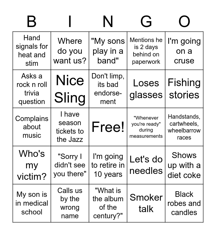 This bingo card has a free space and 24 words: "Sorry I didn't see you there", Calls us by the wrong name, Don't limp, its bad endorse- ment, My son is in medical school, I'm going on a cruse, Hand signals for heat and stim, Asks a rock n roll trivia question, Where do you want us?, "Whenever you're ready" during measurements, I'm going to retire in 10 years, Loses glasses, Complains about music, Let's do needles, Shows up with a diet coke, Nice Sling, Smoker talk, Handstands, cartwheels, wheelbarrow races, "My sons play in a band", Fishing stories, I have season tickets to the Jazz, Black robes and candles, Who's my victim?, Mentions he is 2 days behind on paperwork and "What is the album of the century?".