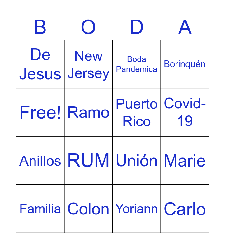 This bingo card has 40 words: Cayey, Unión, Matrimonio, Puerto Rico, Veintidos, 2021, Covid-19, Jean, Free!, Carlo, Marie, Borinquén, Familia, Yoriann, Colon, Cabrera, Bartolomei, De Jesus, Leo, Boda Pandemica, Brindis, Bizcocho, Anillos, Ramo, Recepción, Fiesta, Mascarilla, Juana Diaz, Vega Baja, Agosto, 2017, Noviembre, Valencia, Vellonera, RUM, Mayagüez, Bodeguita, Aljibe, New Jersey and Colegio.