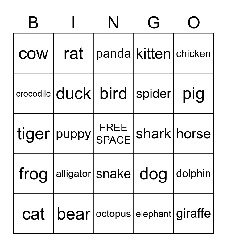 This bingo card has a free space and 24 words: alligator, bear, bird, cat, chicken, cow, crocodile, rat, shark, snake, spider, tiger, dog, dolphin, duck, elephant, horse, panda, pig, puppy, giraffe, frog, kitten and octopus.
