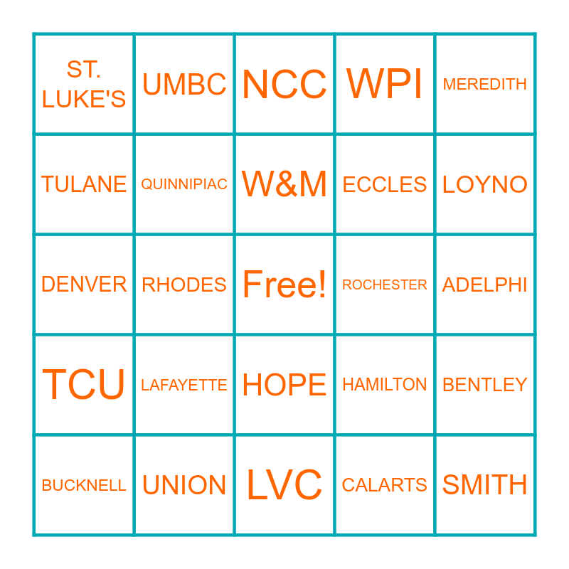 This bingo card has a free space and 24 words: LAFAYETTE, UNION, W&M, BUCKNELL, MEREDITH, ST. LUKE'S, TULANE, UMBC, ROCHESTER, HOPE, ECCLES, DENVER, HAMILTON, BENTLEY, QUINNIPIAC, CALARTS, ADELPHI, NCC, LOYNO, RHODES, SMITH, TCU, WPI and LVC.