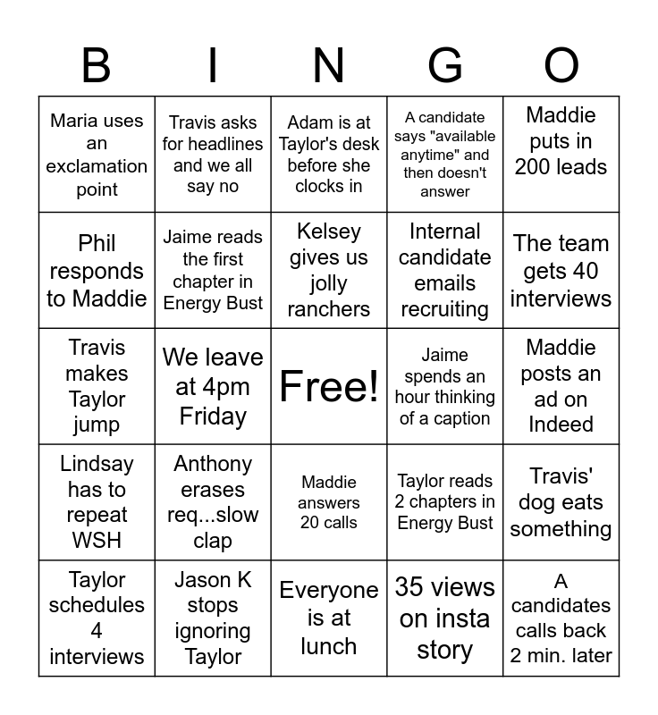 This bingo card has a free space and 24 words: Anthony erases req...slow clap, Jason K stops ignoring Taylor, Kelsey gives us jolly ranchers, Taylor schedules 4 interviews, Maddie puts in 200 leads, Maria uses an exclamation point, Phil responds to Maddie, Travis asks for headlines and we all say no, Jaime spends an hour thinking of a caption, Maddie answers 20 calls, Internal candidate emails recruiting, Travis makes Taylor jump, Taylor reads 2 chapters in Energy Bust, Travis' dog eats something, Jaime reads the first chapter in Energy Bust, 35 views on insta story, Maddie posts an ad on Indeed, Adam is at Taylor's desk before she clocks in, The team gets 40 interviews, We leave at 4pm Friday, A candidates calls back 2 min. later, Lindsay has to repeat WSH, A candidate says "available anytime" and then doesn't answer and Everyone is at lunch.