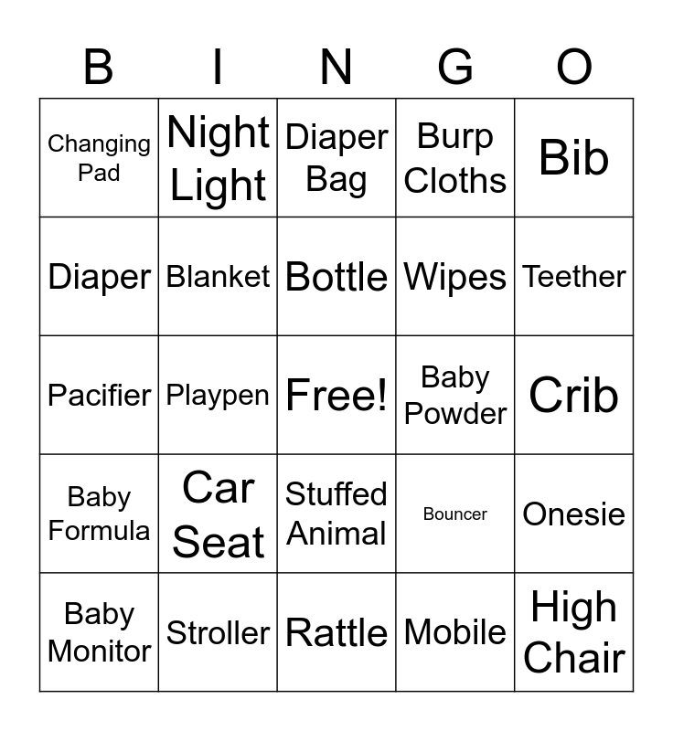This bingo card has a free space and 24 words: Car Seat, Stroller, Bottle, Baby Monitor, Bib, Changing Pad, Diaper, Night Light, Baby Powder, Stuffed Animal, Wipes, Pacifier, Bouncer, Onesie, Blanket, Mobile, Crib, Diaper Bag, Teether, Playpen, High Chair, Baby Formula, Burp Cloths and Rattle.