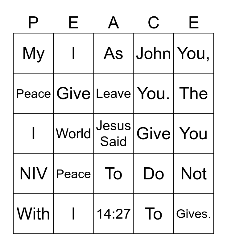This bingo card has a free space and 24 words: Peace, I, Leave, With, You,, My, Peace, I, Give, To, You., I, Do, Not, Give, To, You, As, The, World, Gives., NIV, John and 14:27.