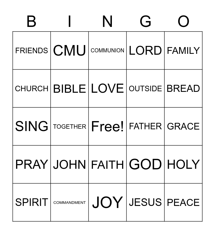 This bingo card has a free space and 24 words: JOHN, COMMANDMENT, LOVE, SPIRIT, FAMILY, FRIENDS, CHURCH, CMU, FATHER, FAITH, OUTSIDE, SING, GOD, HOLY, BIBLE, JESUS, GRACE, COMMUNION, BREAD, TOGETHER, PEACE, PRAY, LORD and JOY.
