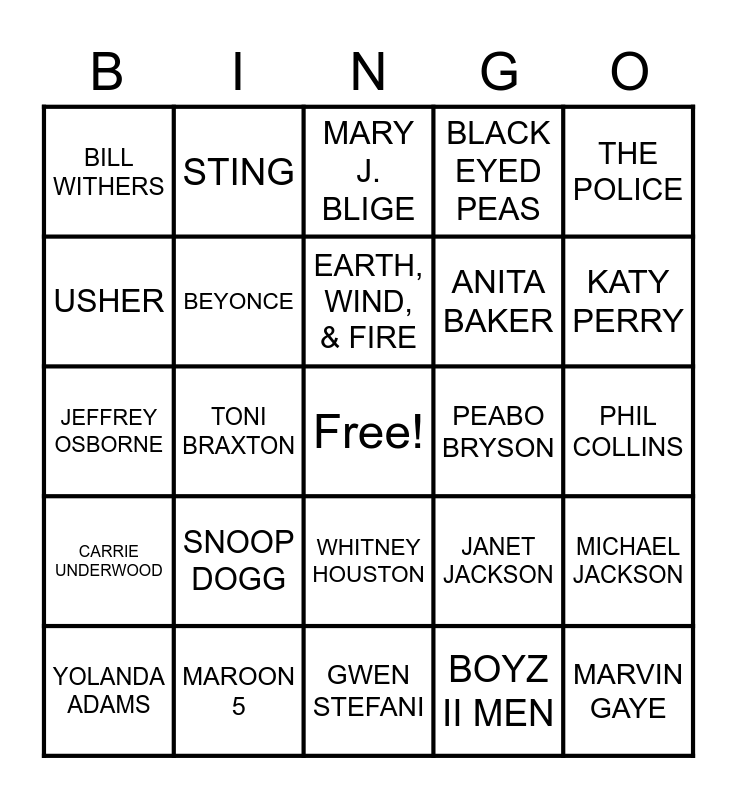 This bingo card has a free space and 24 words: SNOOP DOGG, MAROON 5, EARTH, WIND, & FIRE, YOLANDA ADAMS, THE POLICE, BILL WITHERS, USHER, STING, PEABO BRYSON, WHITNEY HOUSTON, ANITA BAKER, JEFFREY OSBORNE, JANET JACKSON, MICHAEL JACKSON, BEYONCE, BOYZ II MEN, PHIL COLLINS, MARY J. BLIGE, KATY PERRY, TONI BRAXTON, MARVIN GAYE, CARRIE UNDERWOOD, BLACK EYED PEAS and GWEN STEFANI.
