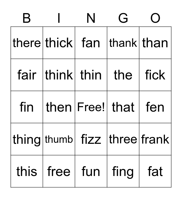 This bingo card has a free space and 24 words: this, thumb, thin, fing, than, there, thick, fan, that, fen, fin, think, three, frank, fair, free, fun, thank, fick, thing, then, fizz, the and fat.