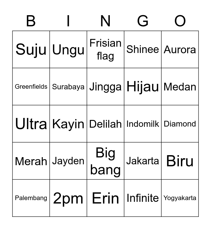 This bingo card has a free space and 24 words: Jayden, 2pm, Jingga, Palembang, Aurora, Suju, Greenfields, Ungu, Indomilk, Big bang, Hijau, Ultra, Jakarta, Biru, Surabaya, Infinite, Diamond, Frisian flag, Medan, Kayin, Yogyakarta, Merah, Shinee and Erin.