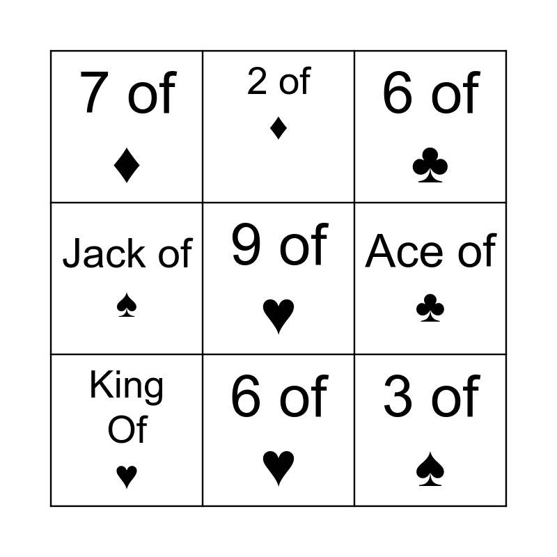This bingo card has 9 words: King Of ♥️, 6 of ♣️, 2 of ♦️, Jack of ♠️, 7 of ♦️, Ace of ♣️, 9 of ♥️, 3 of ♠️ and 6 of ♥️.