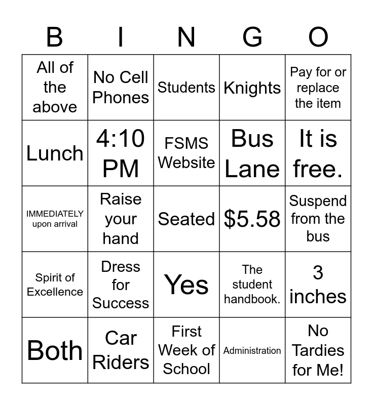 This bingo card has 42 words: Free!, FSMS Website, No, Dress for Success, Administration, 3 inches, Seated, False, Students, Yes, Suspend from the bus, It is free., Raise your hand, Pay for or replace the item, Parent or legal guardian, The student handbook., a signed parent authorization form., IMMEDIATELY upon arrival, Any Time, No Cell Phones, Lunch, C, No Tardies for Me!, All of the above, Searches, School Expectations, Bus Lane, Be prepared, Fire Drills, Be on time, Leadership, Spirit of Excellence, 4:10 PM, First Week of School, Sometimes, Both, Car Riders, $5.58, Football Games, Every Monday, Knights and Restroom Break.