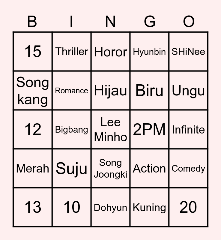 This bingo card has a free space and 24 words: Suju, 10, Hijau, 13, SHiNee, 15, Song kang, Thriller, 2PM, Song Joongki, Biru, 12, Action, Comedy, Romance, Kuning, Infinite, Horor, Ungu, Bigbang, 20, Merah, Hyunbin and Dohyun.