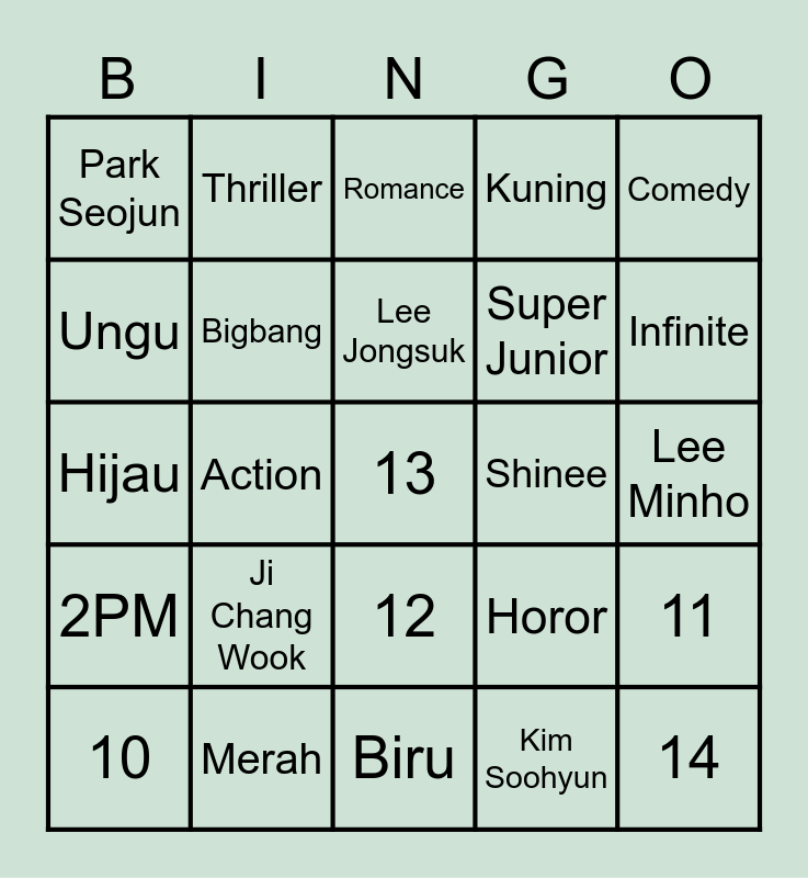 This bingo card has 25 words: 2PM, Merah, 13, Kim Soohyun, Comedy, Park Seojun, Thriller, Romance, Shinee, 11, Ungu, Bigbang, Biru, Horor, Infinite, 10, Action, Lee Jongsuk, Super Junior, Lee Minho, Hijau, Ji Chang Wook, 12, Kuning and 14.