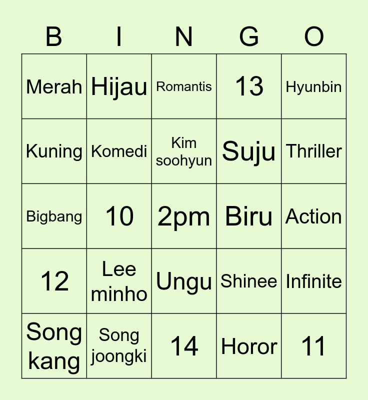 This bingo card has a free space and 24 words: Lee minho, Song joongki, Kim soohyun, Song kang, Hyunbin, Merah, Kuning, Hijau, Biru, Ungu, Suju, Bigbang, Shinee, Infinite, Komedi, Horor, Action, Romantis, Thriller, 10, 11, 12, 13 and 14.