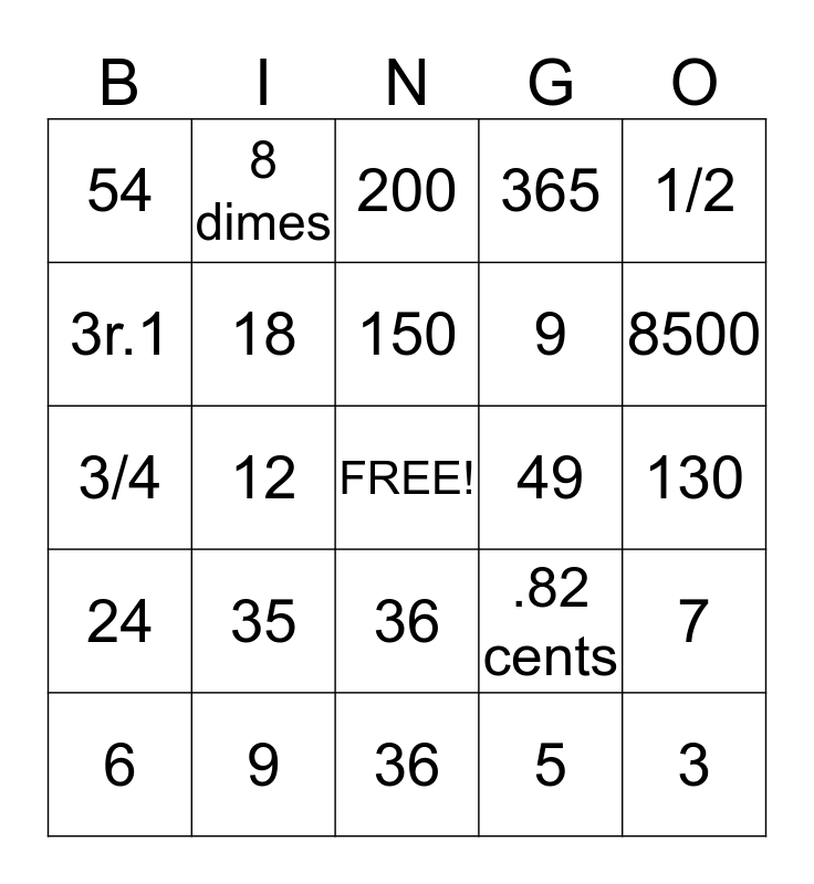 This bingo card has a free space and 24 words: 35, 9, 150, 6, 1/2, 54, 3r.1, 8 dimes, 49, 36, 9, 3/4, .82 cents, 7, 18, 5, 130, 200, 8500, 12, 3, 24, 365 and 36.
