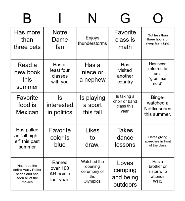 This bingo card has a free space and 24 words: Favorite color is blue, Earned over 100 AR points last year., Has a niece or a nephew, Has read the entire Harry Potter series and has seen all of the movies, Got less than three hours of sleep last night., Has more than three pets, Read a new book this summer, Notre Dame fan, Is taking a choir or band class this year., Likes to draw., Has visited another country, Favorite food is Mexican, Takes dance lessons, Hates giving speeches in front of the class, Has at least four classes with you, Loves camping and being outdoors, Binge-watched a Netflix series this summer., Enjoys thunderstorms, Has been referred to as a “grammar nerd”, Is interested in politics, Has a brother or sister who attends WHS, Has pulled an “all night-er” this past summer, Favorite class is math and Watched the opening ceremony of the Olympics..