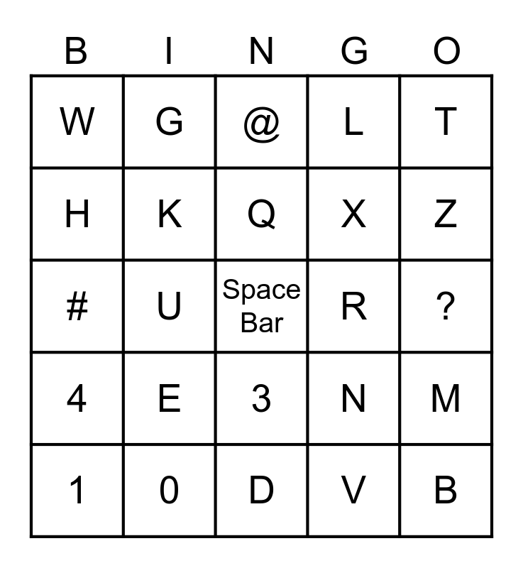 This bingo card has a free space and 46 words: A, B, C, D, E, F, G, G, H, J, K, L, M, N, O, P, Q, R, S, T, U, V, W, X, Y, Z, 1, 2, 3, 4, 5, 6, 7, 8, 9, 0, ?, ., ,, ", ;, @, #, $, * and !.