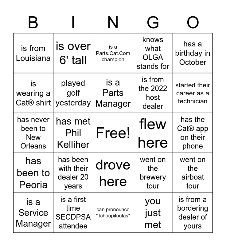 This bingo card has a free space and 24 words: has been with their dealer 20 years, is a first time SECDPSA attendee, is a Parts Manager, is a Service Manager, has a birthday in October, is from Louisiana, is wearing a Cat® shirt, is over 6' tall, flew here, drove here, is from the 2022 host dealer, has never been to New Orleans, went on the brewery tour, went on the airboat tour, played golf yesterday, you just met, has the Cat® app on their phone, is a Parts.Cat.Com champion, started their career as a technician, has met Phil Kelliher, is from a bordering dealer of yours, has been to Peoria, knows what OLGA stands for and can pronounce "Tchoupitoulas".