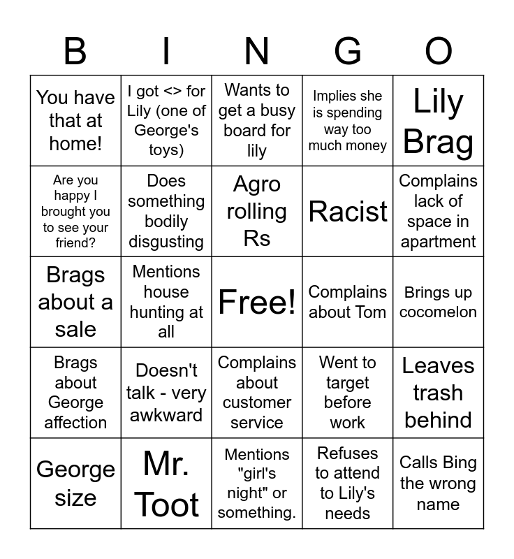 This bingo card has a free space and 24 words: Doesn't talk - very awkward, Mr. Toot, Agro rolling Rs, George size, Lily Brag, You have that at home!, Are you happy I brought you to see your friend?, I got <> for Lily (one of George's toys), Complains about Tom, Complains about customer service, Racist, Brags about a sale, Went to target before work, Leaves trash behind, Does something bodily disgusting, Refuses to attend to Lily's needs, Brings up cocomelon, Wants to get a busy board for lily, Complains lack of space in apartment, Mentions house hunting at all, Calls Bing the wrong name, Brags about George affection, Implies she is spending way too much money and Mentions "girl's night" or something..