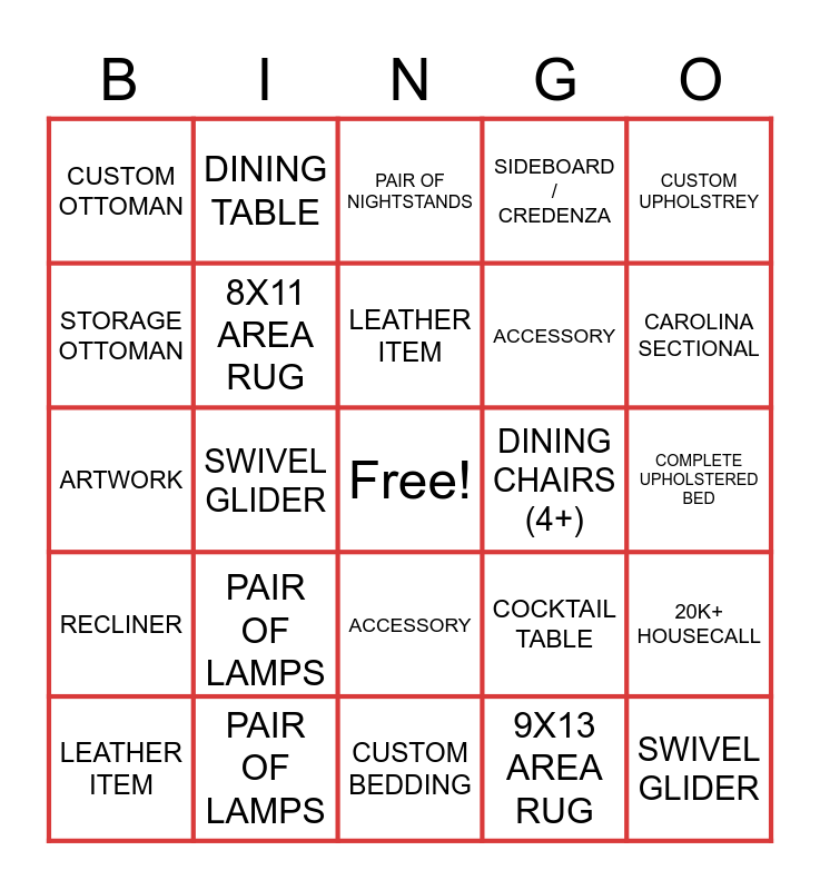 This bingo card has a free space and 24 words: PAIR OF LAMPS, PAIR OF LAMPS, LEATHER ITEM, LEATHER ITEM, CUSTOM UPHOLSTREY, CUSTOM OTTOMAN, STORAGE OTTOMAN, DINING TABLE, DINING CHAIRS (4+), ACCESSORY, ACCESSORY, ARTWORK, COCKTAIL TABLE, 20K+ HOUSECALL, 8X11 AREA RUG, 9X13 AREA RUG, COMPLETE UPHOLSTERED BED, PAIR OF NIGHTSTANDS, CAROLINA SECTIONAL, SWIVEL GLIDER, SWIVEL GLIDER, RECLINER, SIDEBOARD / CREDENZA and CUSTOM BEDDING.