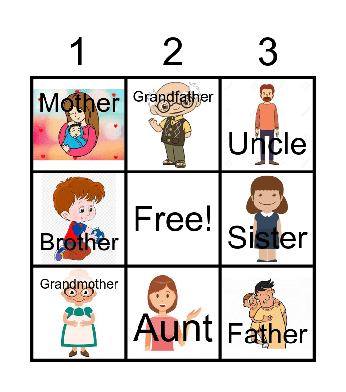 This bingo card has 8 images, a free space and 8 words: Sister, Uncle, Grandfather, Grandmother, Mother, Father, Brother and Aunt.