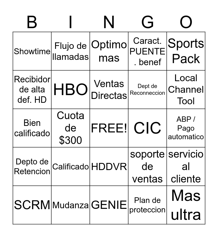 This bingo card has a free space and 24 words: Calificado, Mudanza, Ventas Directas, SCRM, Sports Pack, Showtime, Recibidor de alta def. HD, Flujo de llamadas, CIC, HDDVR, Dept de Reconneccion, Bien calificado, soporte de ventas, servicio al cliente, HBO, Plan de proteccion, ABP / Pago automatico, Optimo mas, Local Channel Tool, Cuota de $300, Mas ultra, Depto de Retencion, Caract. PUENTE . benef and GENIE.