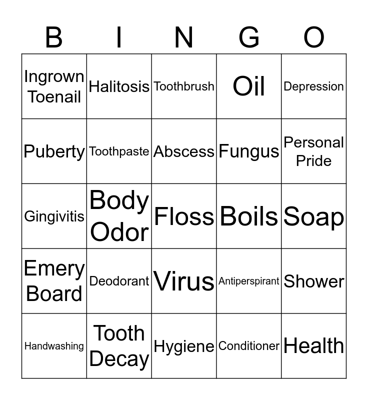 This bingo card has 31 words: Hygiene, Bacteria, Body Odor, Shampoo, Ingrown Toenail, Toothbrush, Toothpaste, Antiperspirant, Boils, Conditioner, Soap, Floss, Health, Athlete's Foot, Personal Pride, Nail Clippers, Shower, Deodorant, Emery Board, Virus, Depression, Sweat, Handwashing, Halitosis, Fungus, Puberty, Oil, Gingivitis, Tooth Decay, Abscess and Clean Clothes.