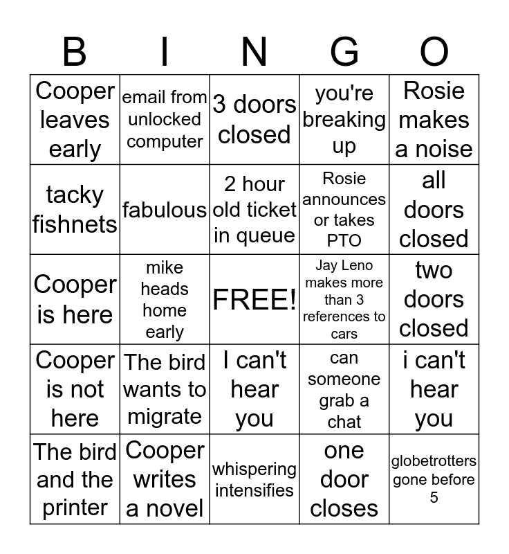 This bingo card has a free space and 24 words: The bird wants to migrate, Cooper writes a novel, 2 hour old ticket in queue, The bird and the printer, Rosie makes a noise, Cooper leaves early, tacky fishnets, email from unlocked computer, Jay Leno makes more than 3 references to cars, I can't hear you, Rosie announces or takes PTO, Cooper is here, can someone grab a chat, i can't hear you, fabulous, one door closes, two doors closed, 3 doors closed, all doors closed, mike heads home early, globetrotters gone before 5, Cooper is not here, you're breaking up and whispering intensifies.