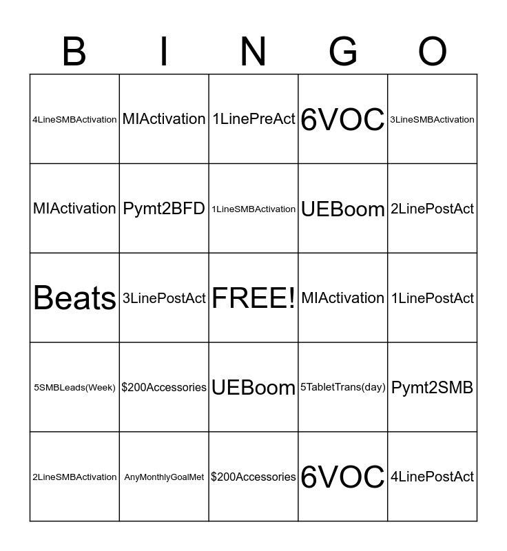 This bingo card has a free space and 25 words: $200Accessories, $200Accessories, 1LineSMBActivation, 2LineSMBActivation, 3LineSMBActivation, 4LineSMBActivation, MIActivation, MIActivation, MIActivation, UEBoom, UEBoom, Beats, 5TabletTrans(day), Pymt2SMB, Pymt2BFD, 5ReferralRegs(day), 1LinePostAct, 1LinePreAct, 2LinePostAct, 3LinePostAct, 4LinePostAct, AnyMonthlyGoalMet, 5SMBLeads(Week), 6VOC and 6VOC.