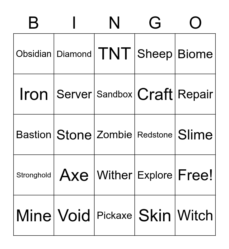 This bingo card has 49 words: Creeper, Zombie, Skeleton, Pickaxe, Axe, Shovel, Diamond, Emerald, Iron, Netherite, Server, Sheep, Free!, Explore, Mob, Enderman, Sandbox, Redstone, Mojang, Biome, Stone, Skin, Obsidian, Craft, Brew, Repair, Mine, Enderdragon, Wither, Stronghold, Village, Mineshaft, Cave Spider, Iron Golem, Void, Bricks, Fortress, Spawner, Slime, Block, Silverfish, Blaze, Witch, Wolf, Bastion, TNT, World, Seed and Coordinates.