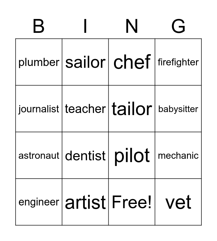 This bingo card has 17 words: Free!, engineer, chef, plumber, dentist, firefighter, mechanic, tailor, babysitter, teacher, artist, pilot, journalist, sailor, astronaut, nurse and vet.