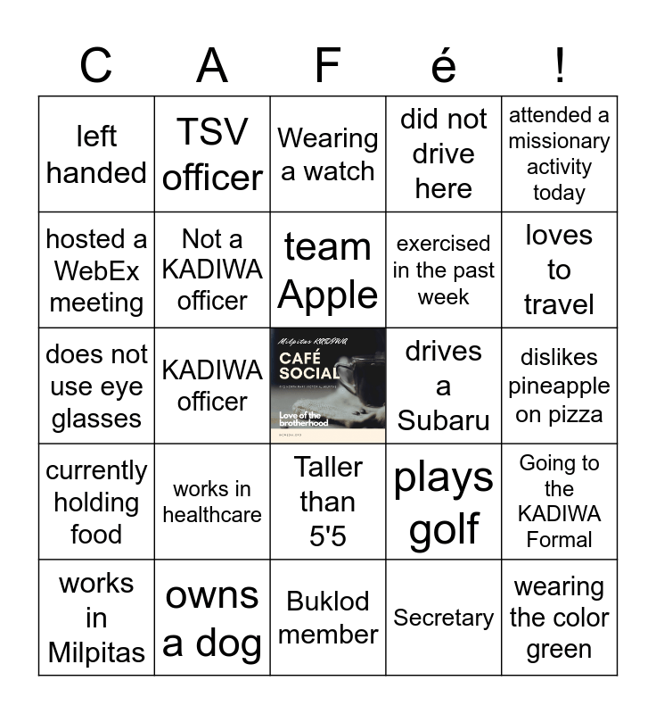 This bingo card has a free space and 24 words: works in healthcare, owns a dog, team Apple, works in Milpitas, attended a missionary activity today, left handed, hosted a WebEx meeting, TSV officer, drives a Subaru, Taller than 5'5, exercised in the past week, does not use eye glasses, plays golf, Going to the KADIWA Formal, Not a KADIWA officer, Secretary, dislikes pineapple on pizza, Wearing a watch, loves to travel, KADIWA officer, wearing the color green, currently holding food, did not drive here and Buklod member.